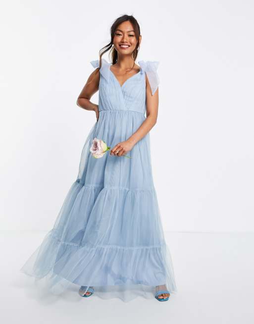 Asos Design Tulle Bow Tie Tiered Maxi Dress In Blue Asos
